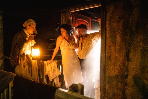 This production features an impressive 3-level set designed by Kevin Hagan. It takes full advantage of the Bookspan space as it reaches up to the ceiling. The production also features two great musicians, Carolyn Waldee and Mary Spencer, who play before the play, during the intermission, and as beggar musicians in the play.
