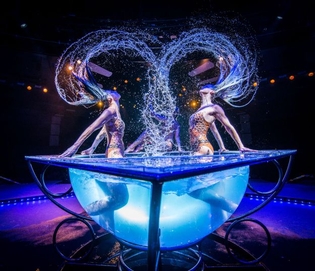 This act features three performers. On about a 4-foot-wide circular platform, the performers spin up to 45 mph on roller skates. Then, the man picks up one of the women and spins her around just by her legs. Then, to increase the intensity, they use a figure 8 device that puts a loop over each of their heads. He then proceeds to spin her around without using his hands in a fantastic finale. The crowd gives them a standing ovation!