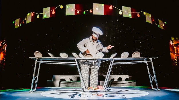 Dressed in a big Italian fat man suit, Victor proceeds to spin plates on a table. He starts with just one, but then builds up to an amazing 10 all at once. It’s quite a sight to see! He also helps out with the crossbow performance by Sylvia Syliva. They have been married for over 50 years!