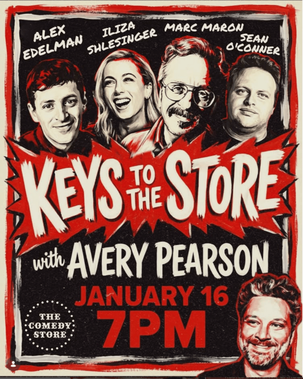 Welcome to the World Famous Comedy Store on Sunset in Hollywood, CA! Tonight’s show is called Keys to the Store. It is hosted by Avery Pearson. It features him playing comedic songs on the keyboards (aka, keys) and key comedians from the LA scene.